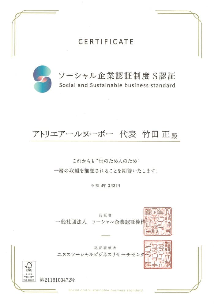 “世のため人のため”に取り組む企業として、2022年3月31日に「ソーシャル企業認証制度 S認証」に認証されました。